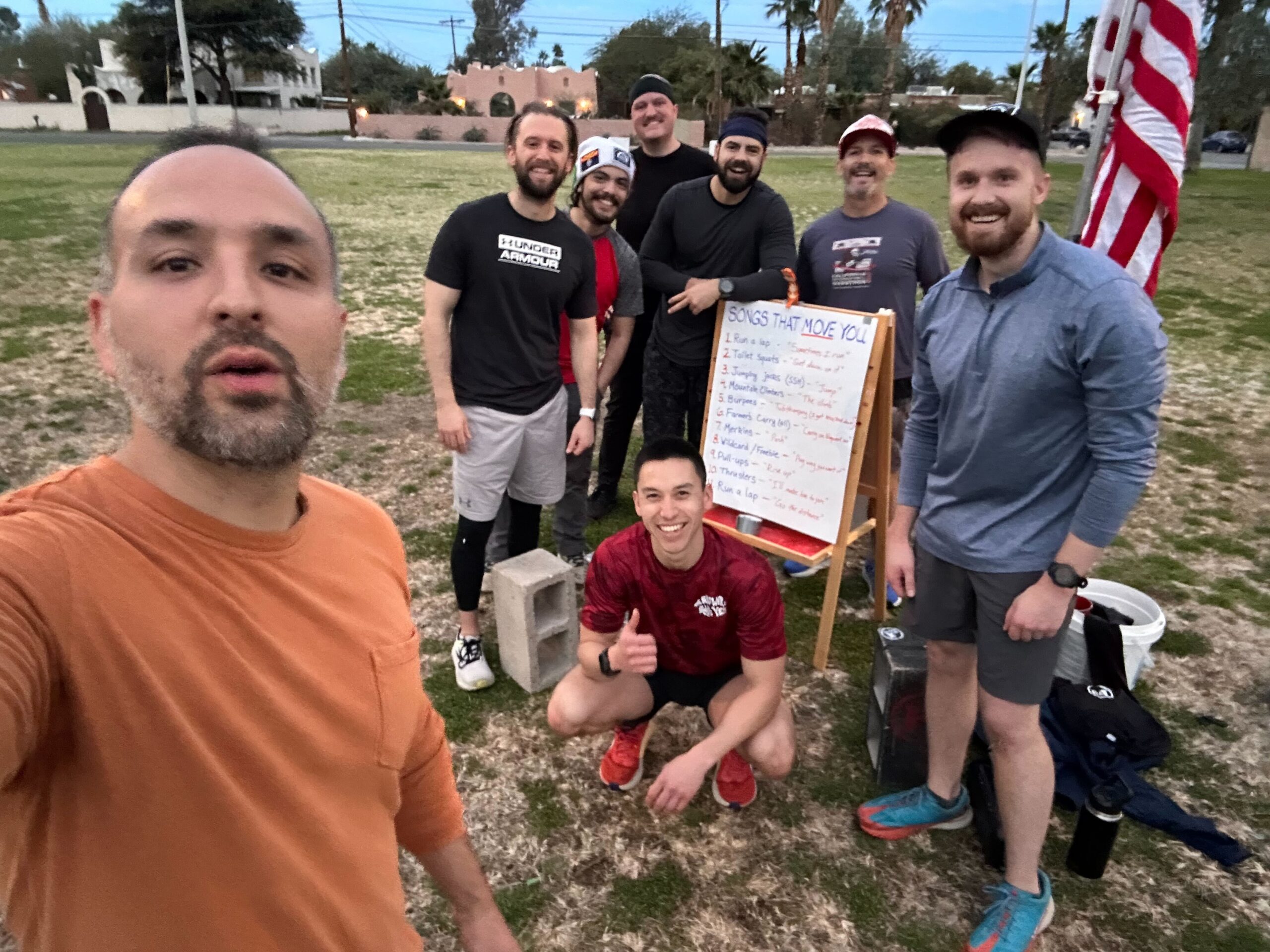 Sometimes songs move us emotionally. Today, they moved us physically. We did exercises based on the titles/choruses of a carefully curated playlist. We did this in a DORA style workout, where one man worked while the other ran, then switched. We did this until the song was over, then moved on to the next song/exercise.