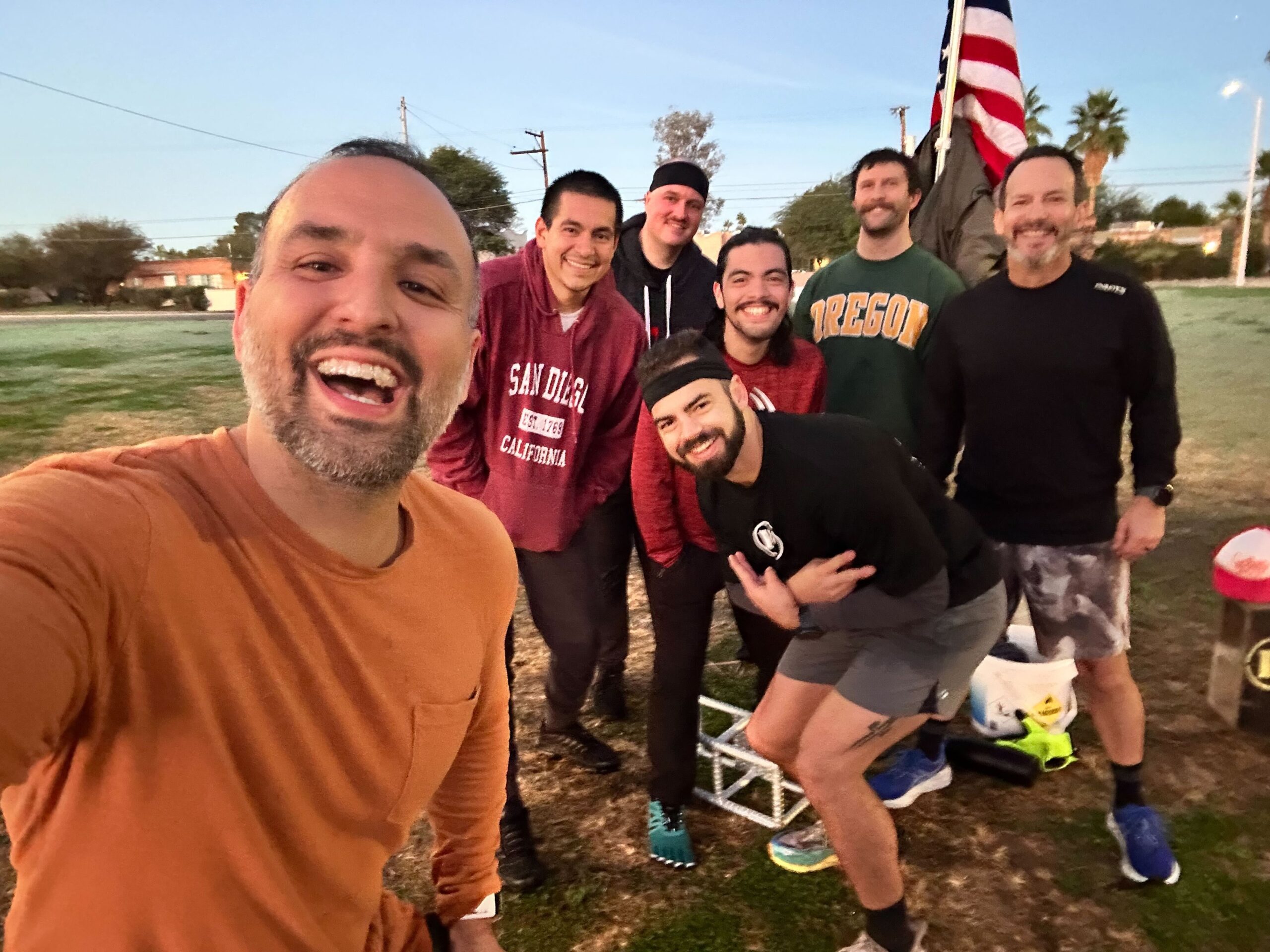 Today’s BD followed the stages of the Hero’s Journey, which is possibly the oldest story of mankind. In it, an ordinary person is called into challenge, tested by struggle, transformed through effort, and returns stronger for the good of others. I chose a song to represent each stage of the journey along with an exercise that symbolically embodies it. One man works while the other runs, then switch. We did this until the song ended then moved on to the next stage.